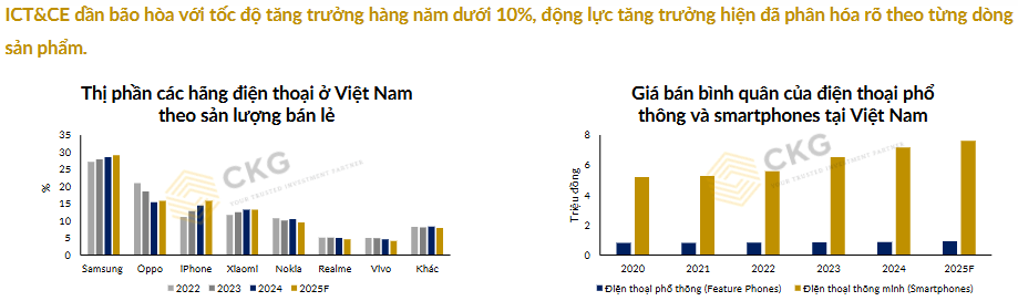 Ngành ICT và CE tăng trưởng chậm lại, dưới 10%/năm, phản ánh trạng thái bão hòa. Tuy nhiên, vẫn tồn tại các động lực riêng biệt. Đối với ICT (điện thoại, laptop, tablet), sản lượng chững lại nhưng giá bán tăng, kéo doanh thu lên nhờ xu hướng nâng cấp thiết bị cao cấp. Trong khi đó, ngành CE (điện máy – tủ lạnh, máy lạnh, máy giặt, TV) vẫn tăng trưởng nhờ mở rộng thâm nhập hộ gia đình, dù phải hạ giá để kích cầu.