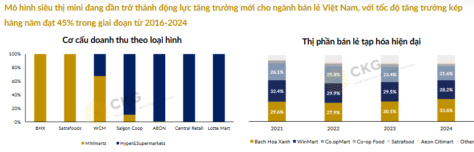 Đặc biệt, mô hình siêu thị mini (minimart) nổi lên như động cơ tăng trưởng chủ lực, với tốc độ tăng trưởng kép 45% giai đoạn 2016–2024, vượt xa mức tăng trung bình 11% của toàn ngành bán lẻ hiện đại. Minimart phù hợp với điều kiện đô thị Việt Nam: diện tích nhỏ (≤500 m²), dễ thâm nhập khu dân cư, hàng hóa thiết yếu và tươi sống, mở cửa đến 22h, đáp ứng thói quen “ghé nhanh – mua ít – thường xuyên”.
