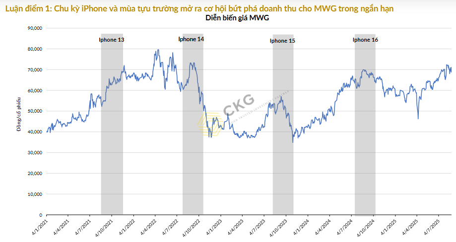 Theo SHS, trong giai đoạn tháng 9–10/2025, MWG chiếm khoảng 20% tổng lượng iPhone bán ra tại Việt Nam, tương đương tăng 40% sản lượng so với cùng kỳ năm 2024, khẳng định vị thế số một trong kênh bán lẻ thiết bị công nghệ cao cấp. Cùng với đó, MWG ghi nhận tăng trưởng doanh số nhóm điện thoại hơn 22% so với cùng kỳ, đưa mảng ICT & CE trở lại vai trò đầu tàu đóng góp trên 60% doanh thu hợp nhất.