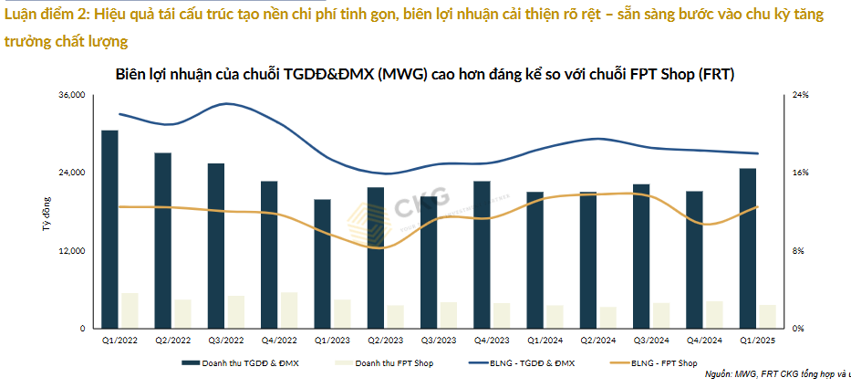 Sau nhiều năm mở rộng mạng lưới, MWG chuyển hướng sang giai đoạn “giảm lượng – tăng chất”. Doanh nghiệp tinh gọn cửa hàng, cắt giảm chi phí, tối ưu vận hành và nâng biên lợi nhuận. Biên lợi nhuận sau thuế và biên gộp của MWG cao hơn đáng kể so với FPT Shop, thể hiện năng lực kiểm soát chi phí và sức mạnh quy mô.