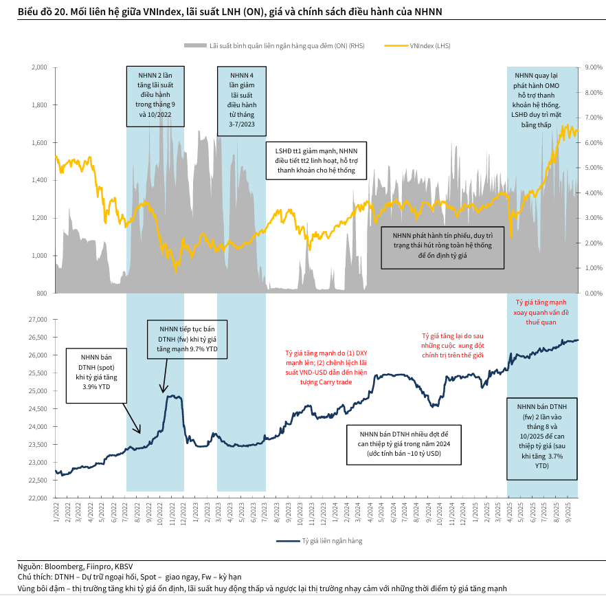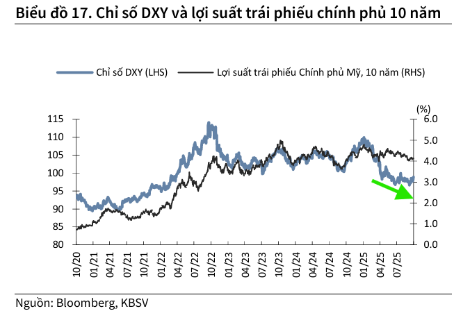 Tuy nhiên, KBSV cho rằng các yếu tố chính giúp tỷ giá ổn định hơn trong quý 4 sẽ đến từ (1) kỳ vọng Fed có thêm 1-2 đợt cắt giảm lãi suất trong năm 2025, và thêm 2 3 lần trong năm 2026; (2) mùa cao điểm xuất khẩu, thấp điểm nhập khẩu cũng như nguồn kiều hồi về nước sẽ gia tăng cung ngoại tệ.