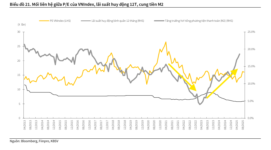 Về tổng thể, KBSV đánh giá điều kiện hiện tại tương đối thuận lợi để thị trường duy trì xu hướng tăng dài hạn nhờ (1) lãi suất duy trì ở mức thấp ít nhất đến hết 2025, tín dụng được đẩy mạnh giúp gia tăng cung tiền M2; (2) tỷ giá trong tầm kiểm soát nhờ chính sách điều hành linh hoạt của NHNN, giai đoạn căng thẳng nhất nhiều khả năng đã qua; và (3) các động lực bổ sung từ câu chuyện nâng hạng cùng sự phục hồi KQKD doanh nghiệp. Quả khứ cho thấy các giai đoạn tỷ giá ổn định, lãi suất duy trì mức thấp, M2 tăng trưởng cao, TTCK Việt Nam thường có xu hướng tăng trưởng mạnh.