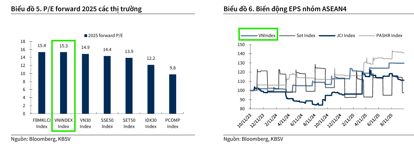 Mức dự báo 1,814 điểm này tương ứng với mức tăng trưởng thu nhập trên mỗi cổ phiếu (EPS) bình quân của các doanh nghiệp niêm yết trên sàn HSX ước tính đạt 18.6% so với cùng kỳ năm trước. Đây là sự điều chỉnh tăng so với mức 16.7% được dự báo trước đó, phản ánh quan điểm tích cực hơn của KBSV về tác động của các chính sách kích thích kinh tế từ Chính phủ. Đồng thời, báo cáo cũng nhấn mạnh rằng vấn đề thuế quan (đã từng là mối lo ngại lớn) không nghiêm trọng như lo sợ ban đầu.