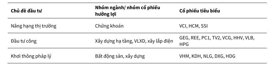 Dựa trên các yếu tố trên, KBSV đề xuất ba chủ điểm đầu tư triển vọng cho giai đoạn cuối năm bao gồm: Nâng hạng thị trường, Đầu tư công, và Khơi thông pháp lý. Việc khơi thông pháp lý, đặc biệt qua việc kỳ vọng những thay đổi trong Dự thảo Luật sửa đổi, bổ sung một số điều của Luật Đất Đai, sẽ giúp đẩy nhanh quá trình triển khai các dự án mới.