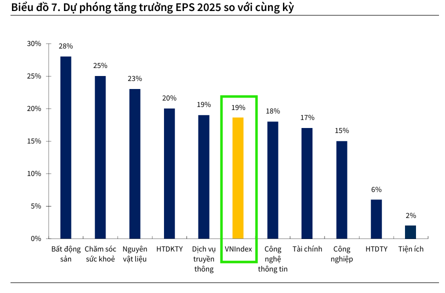 Dẫn đầu đà tăng trưởng là các nhóm ngành có độ nhạy cao với chính sách kinh tế trong nước và chu kỳ kinh tế, bao gồm Bất động sản (+28%), Nguyên vật liệu (+23%), Chăm sóc sức khỏe (+25%), Hàng tiêu dùng không thiết yếu (+20%). Sự phục hồi của các nhóm này được củng cố bởi các chính sách hỗ trợ then chốt của Chính Phủ.