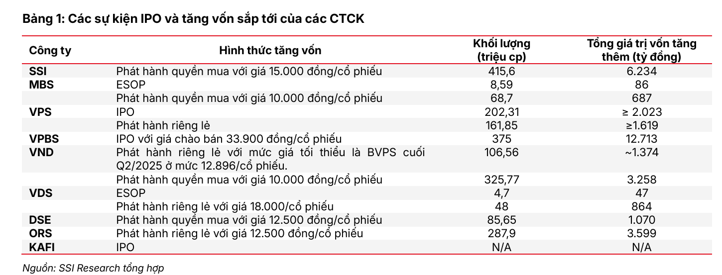 Hoạt động IPO và tăng vốn sẽ tiếp tục hỗ trợ ngành chứng khoán trong năm . Việc đơn giản hóa quy trình IPO, rút ngắn thời gian phê duyệt từ ngày xuống ngày, làm tăng sức hấp dẫn của thị trường sơ cấp. Nhiều công ty lớn như VPS, Techcom Securities (TCX) và VPBS đã công bố kế hoạch niêm yết/chào bán cổ phiếu, qua đó thúc đẩy thanh khoản và hoạt động tư vấn. Các công ty chứng khoán cũng đồng loạt tăng vốn nhằm nâng cao năng lực tài chính và đáp ứng nhu cầu cho vay ký quỹ ngày càng tăng.