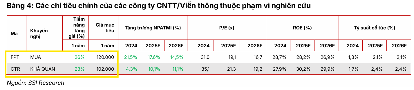 - FPT và CTR được SSI lựa chọn nhờ nền tảng vững và triển vọng tăng trưởng, FPT dẫn đầu mảng chuyển đổi số và AI, còn CTR hưởng lợi từ mảng TowerCo và dịch vụ hạ tầng số.