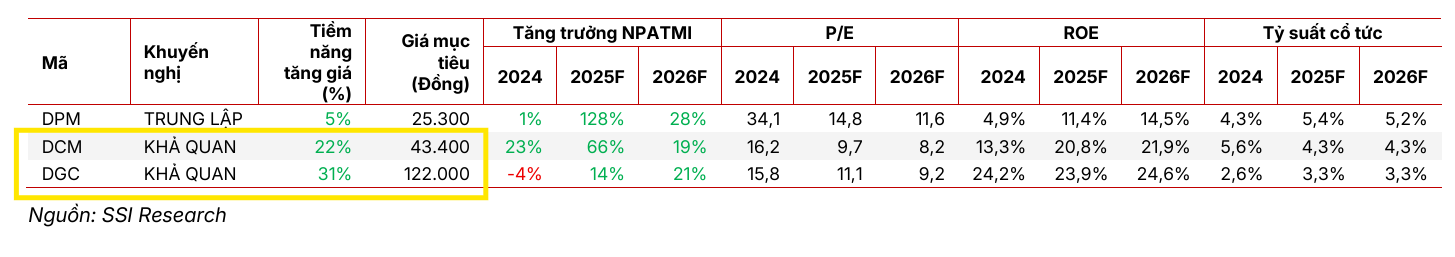 Sau nhịp tăng mạnh trong năm , DPM hiện được SSI đánh giá là có định giá không còn hấp dẫn. Ngược lại, DCM (Giá mục tiêu 43,400 đồng, upside 22%) và DGC (giá mục tiêu 122,000, upside 31%) vẫn đang giao dịch dưới mức P/E trung bình lịch sử (lần lượt là x và x), cho thấy định giá đang hấp dẫn.