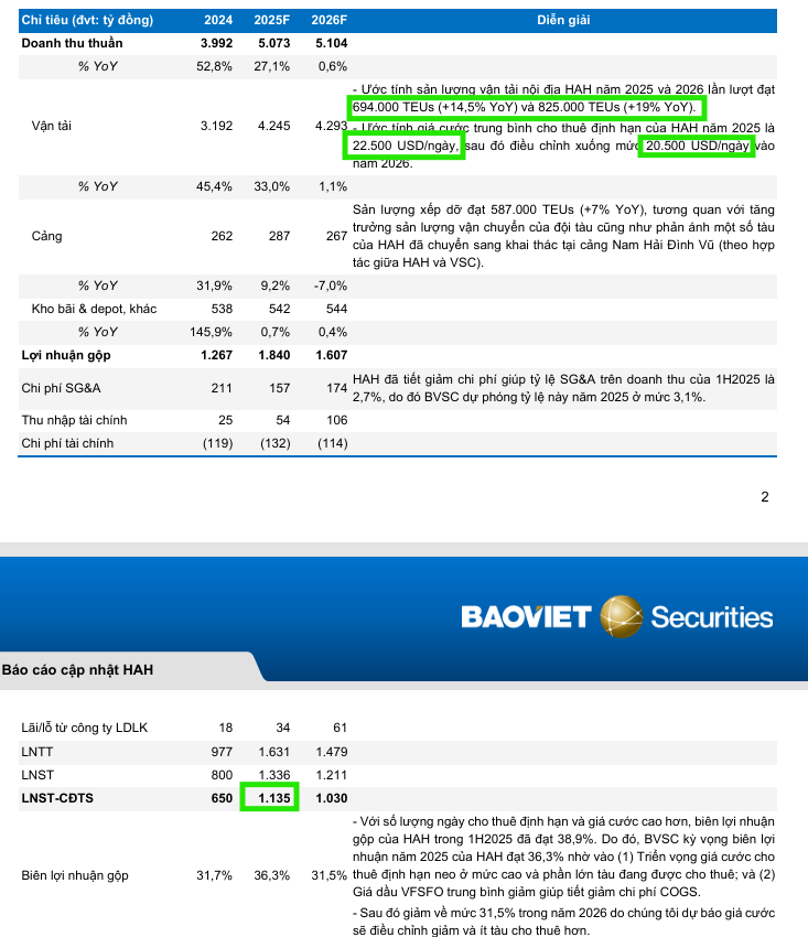 CTCK MBS ước tính LNST quý 3 của HAH đạt 405 tỷ đồng, tăng 103% yoy và 12% qoq. Tổng sản lượng khai thác quý 3/2025 ước tăng 15.6% so với cùng kỳ, trong đó sản lượng cảng tăng 16.1% và khai thác tàu tăng 25.4%. MBS cho rằng hoạt động kinh doanh của HAH trong quý này ít bị ảnh hưởng bởi thuế quan nhờ việc mở rộng tuyến dịch vụ sang Trung Quốc, cùng với nhu cầu vận chuyển nội Á và vật liệu xây dựng trong nước tiếp tục cải thiện.