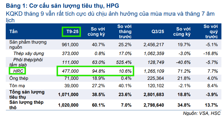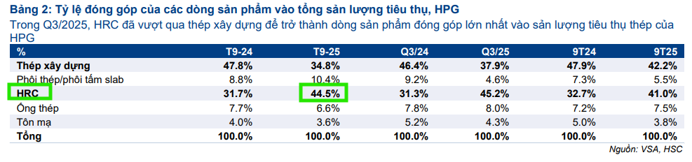 Điểm sáng nổi bật nhất trong giai đoạn này là sản phẩm Thép Cuộn Cán Nóng (HRC). Sản lượng tiêu thụ HRC trong Quý III/2025 tăng mạnh so với cùng kỳ và tăng so với quý trước, đạt triệu tấn. Nhờ tác động tích cực của các chính sách bảo hộ được áp dụng, HRC đã trở thành phân khúc sản phẩm đóng góp lớn nhất vào tổng sản lượng tiêu thụ của HPG (), vượt qua cả thép xây dựng (), và đây là quý đầu tiên ghi nhận sự thay đổi vai trò này.