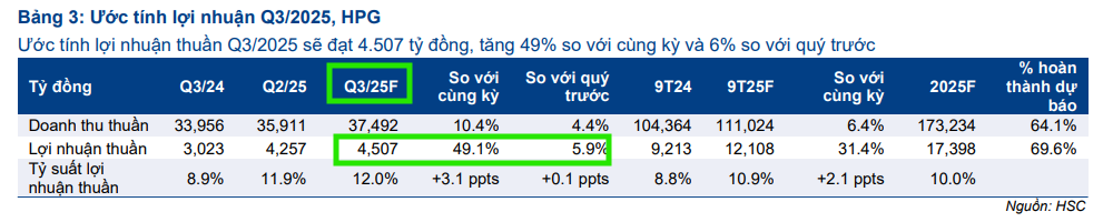 Dựa trên dữ liệu sản lượng tích cực này, HSC dự báo lợi nhuận thuần Quý III/2025 của HPG sẽ đạt tỷ đồng, tăng mạnh so với cùng kỳ và tăng so với quý trước.