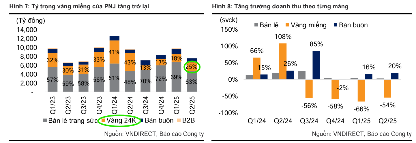 PNJ, mặc dù là nhà bán lẻ trang sức hàng đầu, đã mất đà tăng thị phần về tay SJC từ năm 2023 do những hạn chế giao dịch vàng miếng. VNdirect kỳ vọng việc khôi phục kinh doanh vàng miếng sẽ giúp doanh số vàng của PNJ phục hồi lên 9 nghìn tỷ đồng trong năm 2025 và 10,500 tỷ đồng trong năm 2026.