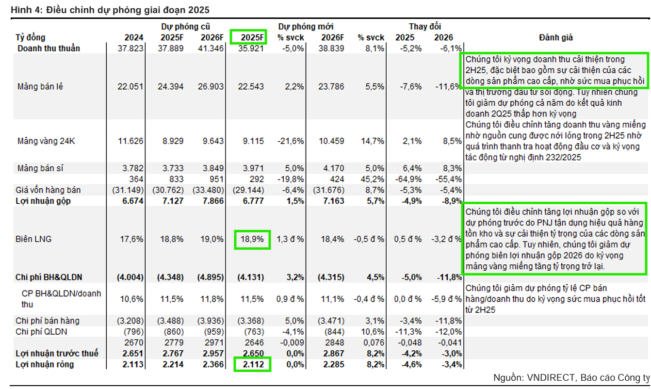 Trong khi đó, MBS thận trọng hơn khi dự đoán LNST quý 3 đạt 240 tỷ, tăng nhẹ +12% so với cùng kỳ và giảm 45% so với quý trước. MBS cho rằng chủ yếu nhờ vào sự tăng trưởng của mảng bán lẻ trang sức (+8% so với cùng kỳ). Do ảnh hưởng của cầu tiêu thụ các sản phẩm trang sức nên chưa có cơ hội mở rộng quy mô, MBS nhận thấy thời điểm thích hợp mở rộng thăm dò có thể bắt đầu từ Q4/2025, do vậy Q3/2025 quy mô cửa hàng khả năng sẽ duy trì so với quý trước. Biên LN gộp cải thiện khoảng 4d% svck nhờ vào sự gia tăng mạnh mẽ của tỷ trọng doanh thu trang sức bán lẻ, bù đắp cho sự gia tăng chi phí bán hàng và quản lý doanh nghiệp.