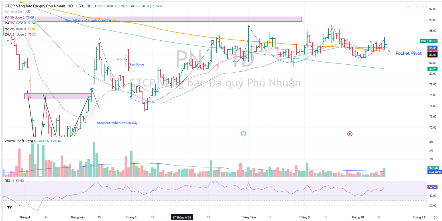 Trên đồ thị, RS của PNJ là 56 và đang trên đà cải thiện theo sóng ngành bán lẻ. Ngày 15.10.2025, PNJ có điểm mua Pocket Pivot ở vùng giá 86,000.