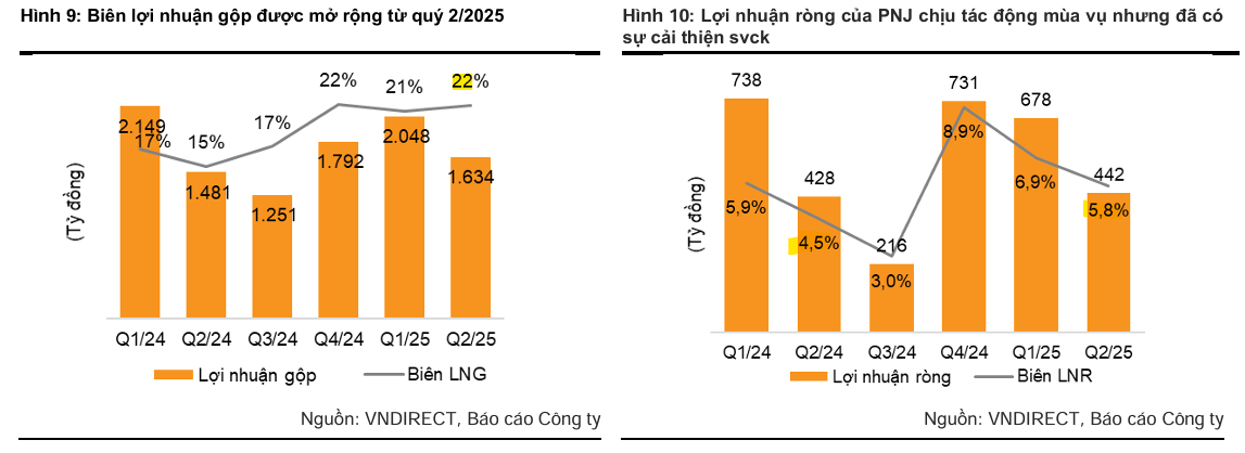 Việc cải thiện biên lợi nhuận đến từ sự chuyển dịch cơ cấu doanh thu từ vàng 24K (có biên thấp) sang mảng trang sức bán lẻ (có biên cao hơn), cùng với khả năng tận dụng tốt hàng tồn kho giá thấp và chiến lược định giá hiệu quả cho các dòng sản phẩm mới.