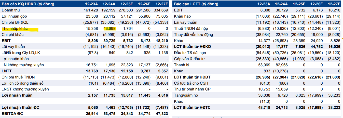 Dòng tiền tự do (FCF) tiếp tục âm mạnh ở mức -17,545 tỷ đồng năm 2025F, sau khi âm -32,849 tỷ đồng năm 2024, phản ánh áp lực đầu tư và chi phí vận hành lớn. Dự kiến chỉ đến năm 2026F, dòng tiền mới chuyển sang dương 25,191 tỷ đồng, nếu các dự án sản xuất bắt đầu tạo doanh thu.