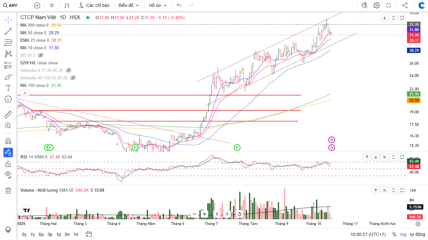 Trên đồ thị kỹ thuật, ANV có RS=98, mức hoạt động tốt trên thị trường. Hành động giá hiện nay cho thấy ANV đang trong nhịp nghỉ, sau nhịp tăng mạnh, và vẫn nằm trong xu hướng tăng trung – dài hạn. Khả năng cao ANV sẽ tìm hỗ trợ ở quanh EMA21 ngày.