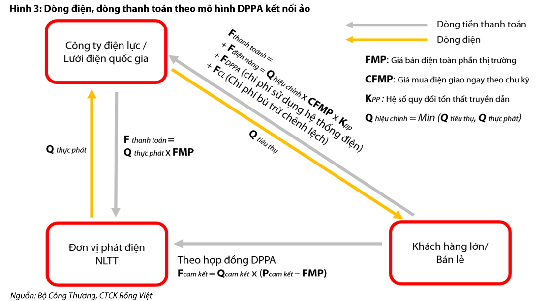 Khoản bù trừ chênh lệch (Fc): Đây là khoản phí đáng kể trong mô hình kết nối ảo, không trực tiếp liên quan đến NLTT, được dùng để cân bằng chi phí với các nguồn BOT, thủy điện chiến lược, và các nhà máy khác. VDSC coi đây là rào cản lớn đối với cơ chế DPPA. Tuy nhiên, Bộ Công Thương đang yêu cầu EVN loại bỏ phần chi phí này để giảm gánh nặng cho khách hàng.