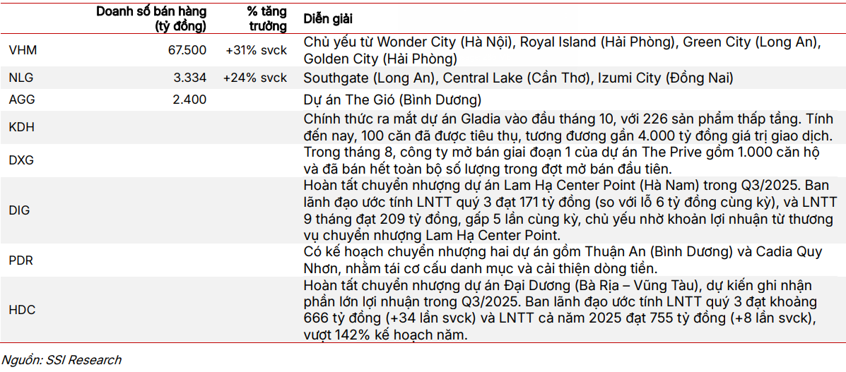 • VHM dẫn đầu với doanh số 67,500 tỷ đồng (+31%), NLG tăng 24%, trong khi KDH, DXG, HDC và DIG đều phục hồi mạnh nhờ tái cơ cấu danh mục và chuyển nhượng dự án. SSI dự báo lợi nhuận 2025 của nhóm này tăng 8-23%, tiếp tục cải thiện trong 2026.