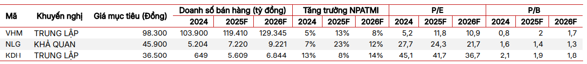 Về định giá, VHM đang giao dịch ở mức P/B 2.0 lần, tương đương trung bình 5 năm; NLG ở mức 1.5 lần và KDH ở mức 2.0 lần, thấp hơn trung bình lịch sử, cho thấy dư địa tăng giá khi thị trường hồi phục.