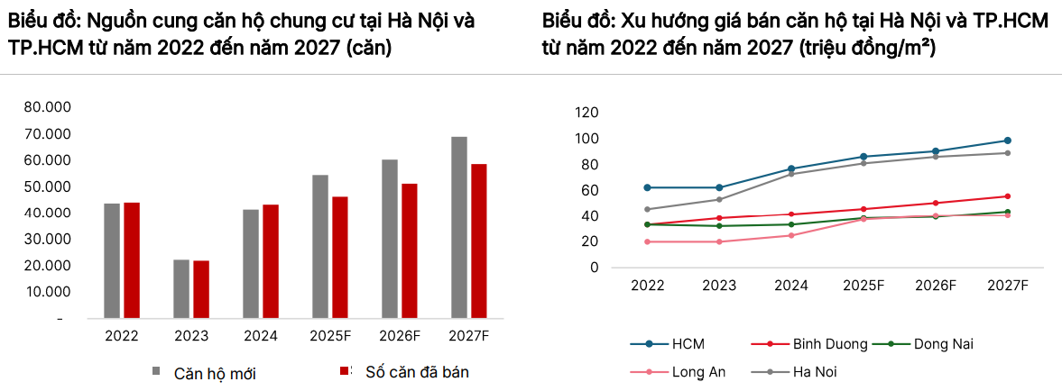 • Nguồn cung nhà ở được dự báo tăng mạnh, đạt 54,500 căn năm 2025 và 60,300 căn năm 2026 (tăng lần lượt 32% và 11%). Tỷ lệ hấp thụ duy trì 85-90%, tương đương giai đoạn 2015-2018, cho thấy thị trường đã quay lại trạng thái cân bằng.