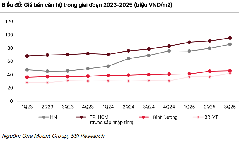Giá bán căn hộ vẫn duy trì ở mức cao, dù tốc độ tăng chậm hơn. Tại Hà Nội, giá trung bình đạt 86 triệu đồng/m², tăng 23% so với cùng kỳ; tại TP.HCM, giá trung bình đạt 95 triệu đồng/m², tăng 21%. Điều này cho thấy cầu thực vẫn vững vàng trong khi nguồn cung chất lượng cao chiếm tỷ trọng lớn.