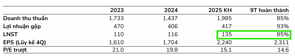 Lũy kế 9 tháng đầu năm 2025, NAF đạt doanh thu thuần (DTT) 1,694 tỷ VNĐ (+53% so với cùng kỳ) và lợi nhuận sau thuế (LNST) 115 tỷ VNĐ (+25% so với cùng kỳ). Các chỉ tiêu này đã hoàn thành 85% kế hoạch doanh thu và 85% kế hoạch lợi nhuận năm, cho thấy khả năng vượt kế hoạch tích cực.