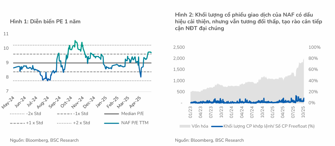 NAF hiện đang giao dịch ở mức P/E trượt 4 quý gần nhất là 14.6 lần, cao hơn mức trung bình giai đoạn 2021–2025 là 12,5 lần. BSC cho rằng mức định giá này đã phần nào phản ánh nỗ lực xoay trục sang các thị trường chất lượng cao (Mỹ, châu Âu) cũng như chiến lược mở rộng vùng nguyên liệu.