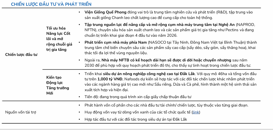 1. Tối ưu hóa năng lực cốt lõi: Nâng cấp và mở rộng cụm nhà máy trung tâm tại Nghệ An (chuyên sâu hóa chanh leo và sản phẩm giá trị gia tăng như Pectins), đồng thời phát triển cụm nhà máy phía Nam thành trung tâm chế biến chuyên sâu các sản phẩm sấy cao cấp (sấy dẻo, sấy giòn, sấy thăng hoa).