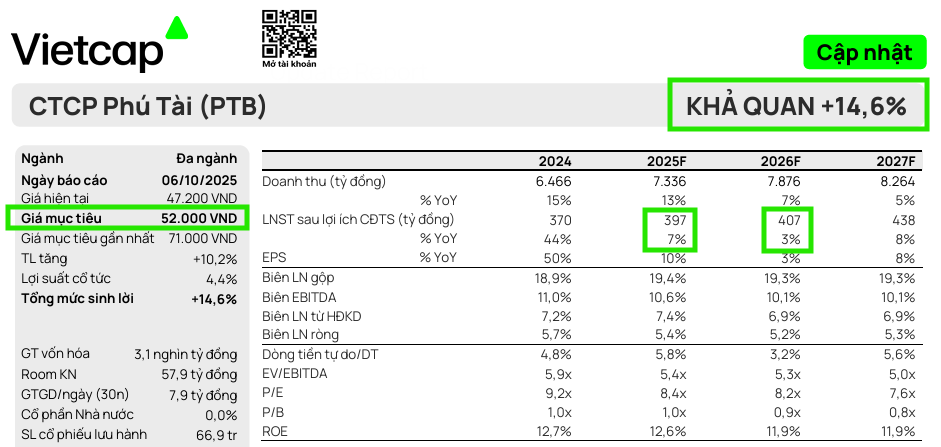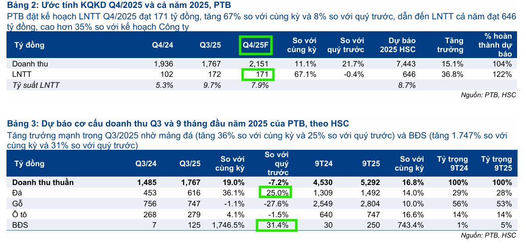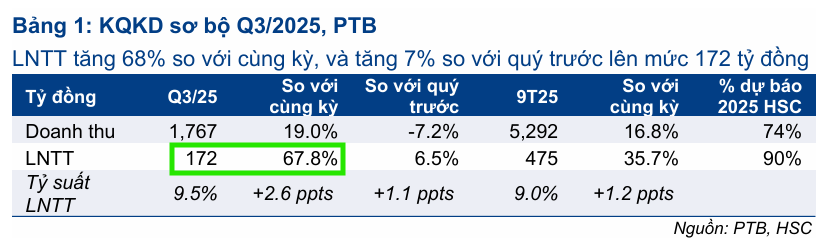 Lũy kế 9 tháng đầu năm 2025, LNTT của PTB đạt 475 tỷ đồng, tăng 36% so với cùng kỳ, hoàn thành 90% dự báo cả năm 2025 của HSC, trên doanh thu thuần 5,292 tỷ đồng (hoàn thành 74% dự báo cả năm).