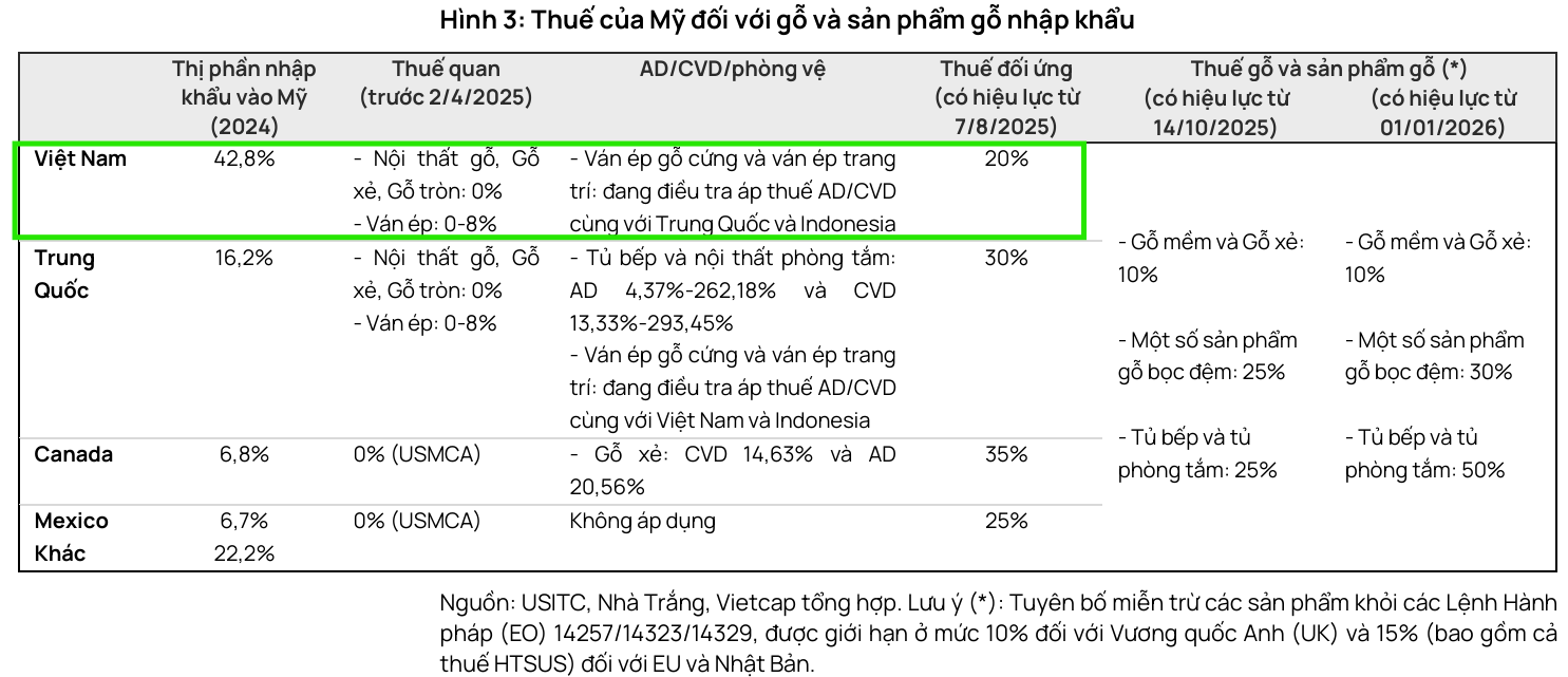 HSC nhấn mạnh rằng chênh lệch tăng thuế là rất nhỏ và trong tầm kiểm soát, cho thấy tác động ban đầu của chính sách thuế quan theo ngành mới đối với ngành gỗ là không lớn. Thậm chí, ban lãnh đạo của một công ty gỗ trong danh mục khuyến nghị của HSC (PTB) vẫn kỳ vọng số lượng đơn đặt hàng gỗ nguyên khối từ Mỹ – thị trường lớn nhất của công ty – vẫn vững chắc trong Quý 4/2025 và năm 2026.