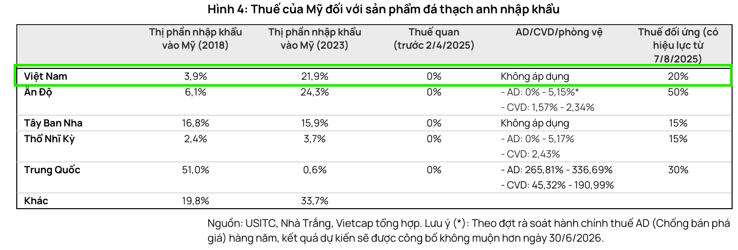 Theo Ủy ban Thương mại Quốc tế Hoa Kỳ (USITC), thị trường nhập khẩu đá thạch anh của Mỹ trong năm 2023 dẫn đầu bởi Ấn Độ (24.3%), Việt Nam (21.9%) và Tây Ban Nha (15.9%). Ấn Độ vẫn duy trì lợi thế cạnh tranh về chi phí cao, đưa ra mức giá bán trung bình thấp hơn khoảng 40% so với Vicostone – nhà xuất khẩu đá thạch anh lớn nhất Việt Nam, theo chia sẻ của Chủ tịch công ty.