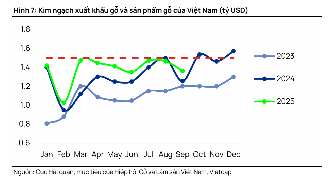 Công ty Chứng khoán HSC đánh giá rằng Sắc lệnh 10976 của Mỹ, áp dụng chính sách thuế quan theo Mục 232 đối với một số sản phẩm liên quan đến gỗ có hiệu lực từ ngày 14/10/2025, có tác động gián đoạn không đáng kể đến hoạt động xuất khẩu gỗ của Việt Nam. Do đó, HSC giữ nguyên dự báo tăng trưởng thương mại cho năm 2025.