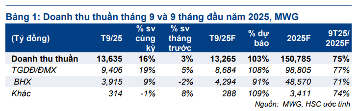 Lũy kế 9 tháng đầu năm 2025, doanh thu thuần của MWG đạt 113,436 tỷ đồng, tăng 14% so với cùng kỳ, hoàn thành 75% dự báo cả năm của HSC.