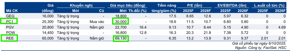 • HSC khuyến nghị “Tăng tỷ trọng” với PC1, GEG, POW, PGV và REE, nhờ vị thế hưởng lợi từ cải cách pháp lý, sản lượng hợp đồng phân bổ cao, và danh mục dự án năng lượng tái tạo đang mở rộng.