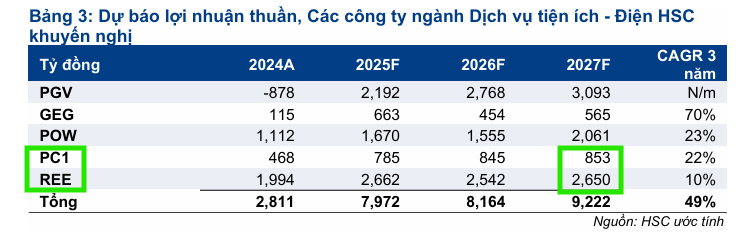 PC1: Có vị thế tốt để hưởng lợi từ quy định mới hỗ trợ tư nhân tham gia đầu tư truyền tải điện, năng lượng tái tạo và DPPA, giúp thúc đẩy mảng EPC và tốc độ triển khai dự án. Lợi nhuận nửa cuối năm 2025 dự kiến hồi phục nhờ ghi nhận doanh thu EPC (đường dây 500 kV) và bàn giao dự án BĐS. Lợi nhuận thuần CAGR 2024-2027: 22%.
