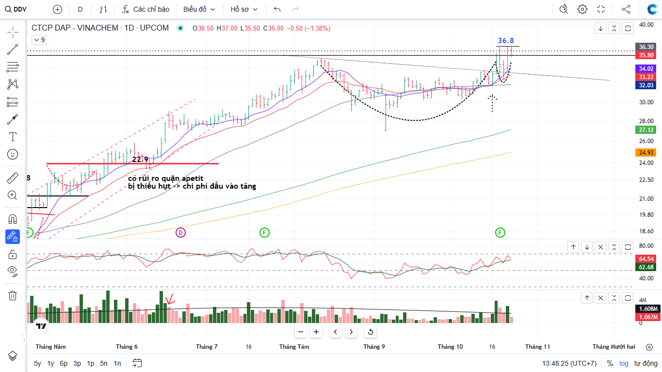 Xét yếu tố kỹ thuật, DDV đã nỗ lực phá đỉnh phiên ngày 23/10/2025 nhờ kết quả kinh doanh quý 3 tích cực, điểm breakout thành công quanh giá sẽ là 36,800 đồng, phiên hôm qua có thể xem là điểm mua pocket pivot của cổ phiếu (thành công breakout đỉnh cũ tại giá 35,700 đồng), trader được khuyến nghị mua quanh giá hiện tại.