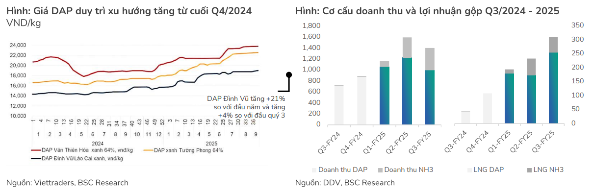 Đối với mảng NH₃, BSC dự báo hoạt động sẽ tiếp tục ổn định trong quý 4/2025 và quý 1/2026 với doanh thu, lợi nhuận gộp tương đương quý 2-3/2025, nhờ nhu cầu bền vững từ khách hàng công nghiệp lớn. Như vậy, trong ngắn hạn, DDV nhiều khả năng vẫn duy trì được lợi nhuận cao, nhưng rủi ro điều chỉnh giảm lợi nhuận có thể xuất hiện từ giữa năm 2026 khi giá DAP thế giới hạ nhiệt.