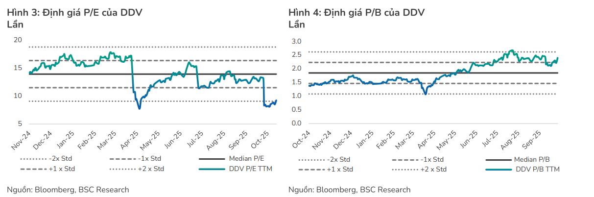 - Với EV/EBITDA forward 2025 chỉ 4.9x, chiết khấu 44% so trung vị 5 năm, cổ phiếu DDV vẫn hấp dẫn về định giá. Tuy nhiên, BSC duy trì khuyến nghị “NẮM GIỮ”, phản ánh dư địa tăng giá còn hạn chế khi giá mục tiêu 36,900 đồng/cp chỉ cao hơn 9% so với thị giá ngày 21/10/2025 (33,900 đồng/cp).