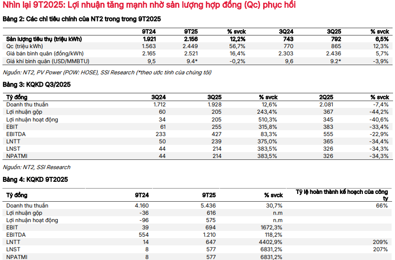 NT2 ghi nhận KQKD quý 3/2025 vượt kỳ vọng của SSI và Vietcap, với doanh thu 1,928 tỷ đồng (+13% YoY) và LNST đạt 214 tỷ đồng, gấp 4.8 lần cùng kỳ, mức cao nhất trong 4 năm. Lũy kế 9 tháng, doanh thu đạt 5,436 tỷ đồng (+31% YoY) và LNST tăng hơn 68 lần, hoàn thành 207% kế hoạch năm của doanh nghiệp, nhờ sản lượng Qc tăng 57%, giá bán bình quân cao hơn 16% và giá khí giảm 3%.