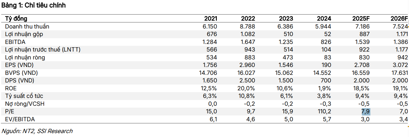 Năm 2025, SSI dự báo doanh thu NT2 đạt 7,186 tỷ đồng (+21% YoY) và lợi nhuận sau thuế đạt 830 tỷ đồng (+901% YoY), với mức cổ tức dự kiến 2,000 đồng/cổ phiếu, tương đương tỷ suất cổ tức hơn 9%. Hệ số P/E dự phóng năm 2025 là 7.9 lần, thấp hơn đáng kể so với trung bình ngành điện, phản ánh dư địa tăng giá cổ phiếu lớn.