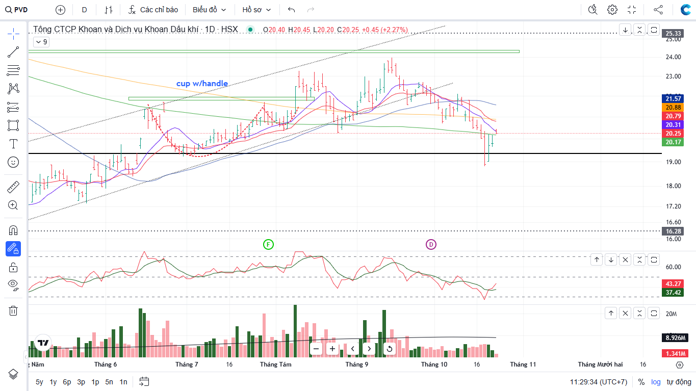 Sau phiên giảm 94 điểm, PVD đã bị đạp về dưới MA150 ngày, tìm hỗ trợ quanh giá 20,000 đồng. Lưu ý, các đường MA quan trọng cũng dốc xuống, sóng dầu khí chưa có, và chỉ đang trong pha tích lũy (mặc dù đang nằm trong giai đoạn gặt hái lợi nhuận), khuyến nghị chỉ tích lũy nhẹ vị thế, hạn chế đặt vị thế lớn ở dầu khí, ngắn hạn vẫn sẽ có phiên hồi kỹ thuật, nhưng về dài hạn sẽ cần tích lũy.