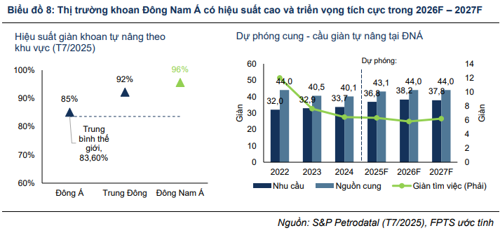 Theo dữ liệu từ S&P Global và FPTS, hiệu suất hoạt động giàn khoan tại Đông Nam Á đang dẫn đầu toàn cầu, đạt 96% vào tháng 7/2025, trong khi đơn giá thuê giữ ở mức cao khoảng 100 nghìn USD/ngày. Sau đợt nguồn cung tăng ngắn hạn từ Trung Đông trong năm 2024, thị trường nhanh chóng hấp thụ hết số giàn bổ sung, đưa khu vực trở lại trạng thái cân bằng. Giai đoạn 2026-2027 được dự phóng sẽ tiếp tục duy trì hiệu suất cao và giá thuê ổn định.