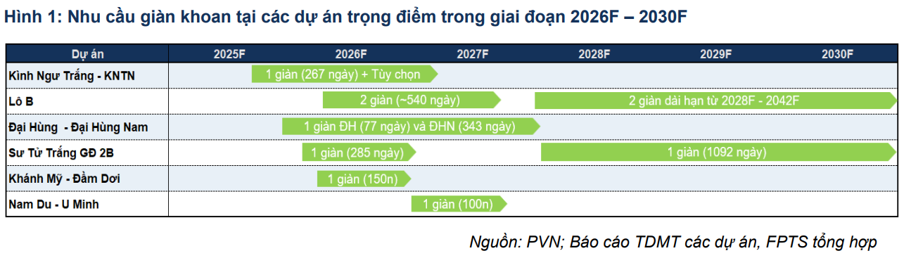Đối với mảng dịch vụ kỹ thuật giếng khoan, FPTS dự phóng doanh thu năm 2025 đạt 3,561 tỷ đồng (+45.5% YoY), lợi nhuận gộp 837 tỷ đồng (+66.5% YoY). Giai đoạn 2026-2028, doanh thu tăng trưởng bình quân 14%/năm, đạt 5,276 tỷ đồng vào năm 2028. Riêng dự án Lô B được ước tính mang lại 1,000-1,350 tỷ đồng doanh thu/năm cho mảng này trong ba năm phát triển đầu tiên.