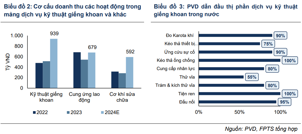 Bên cạnh đó, mảng dịch vụ kỹ thuật giếng khoan, vốn là trụ cột lợi nhuận ổn định ngay cả trong giai đoạn khó khăn 2017-2021, tiếp tục thể hiện vai trò quan trọng. Với thị phần gần như tuyệt đối ở các dịch vụ kỹ thuật như trám và kích thử vỉa, đo karota khí, kéo thả ống chống, thử vỉa và cung ứng nhân lực, PVD duy trì biên lợi nhuận gộp cao (khoảng 20-25%) và đóng góp bình quân 300-400 tỷ đồng lợi nhuận gộp mỗi năm.