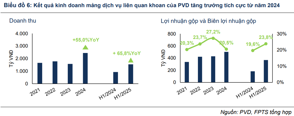 Điểm sáng nổi bật nằm ở mảng kỹ thuật giếng khoan, nơi doanh thu tăng 65.8% và lợi nhuận gộp tăng gấp đôi, đạt 368 tỷ đồng với biên lợi nhuận gộp 23.8%. Động lực chính đến từ nhu cầu dịch vụ trong nước tăng mạnh kể từ cuối 2024, đặc biệt ở các dự án Đại Hùng Pha 3 và chiến dịch thăm dò của Murphy Oil tại mỏ Hải Sư Vàng – Lạc Đà Hồng.