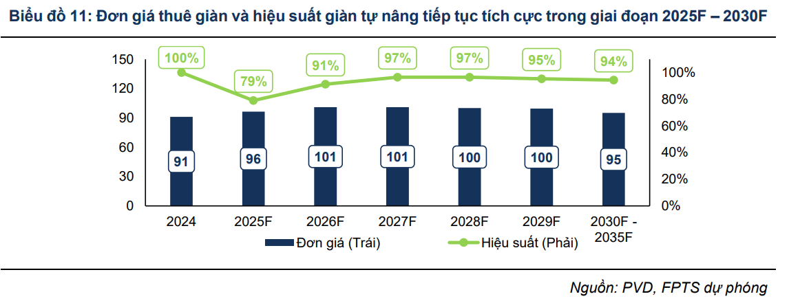 Hiệu suất giàn dự kiến duy trì ổn định 94-96% trong dài hạn, trong khi đơn giá thuê có thể giảm nhẹ về mức 95-98 nghìn USD/ngày do tập trung nhiều hơn vào thị trường nội địa. Tuy nhiên, biên lợi nhuận vẫn được bảo toàn nhờ chi phí khoan thấp hơn và khả năng cung cấp trọn gói dịch vụ.