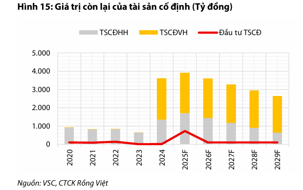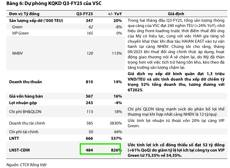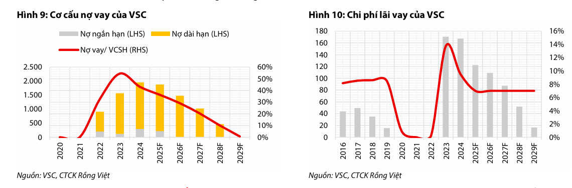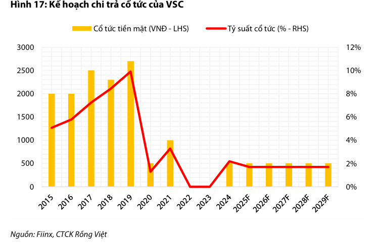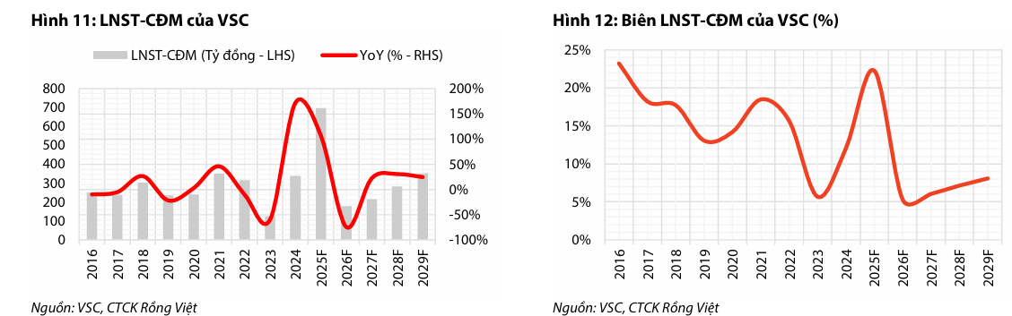 Nhờ các yếu tố này, VDSC dự phóng LNST cổ đông công ty mẹ (LNST-CĐM) năm 2025 của VSC đạt 696 tỷ đồng (tăng 107% so với cùng kỳ). Tuy nhiên, nếu loại trừ lợi nhuận bất thường từ thoái vốn, LNST-CĐM cốt lõi ước tính chỉ đạt 327 tỷ đồng (đi ngang so với cùng kỳ).