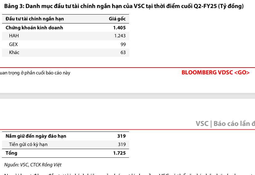 Trong 6 tháng đầu năm 2025 (6T2025), doanh thu tài chính đạt 100 tỷ đồng, trong đó 78 tỷ đồng đến từ đầu tư cổ phiếu, chiếm khoảng 40% Lợi nhuận sau thuế (LNST). Danh mục đầu tư chứng khoán của VSC tập trung chủ yếu vào cổ phiếu HAH, đây được xem là một khoản đầu tư mang tính chiến lược nhằm mở rộng hệ sinh thái, tạo hiệu ứng cộng hưởng.