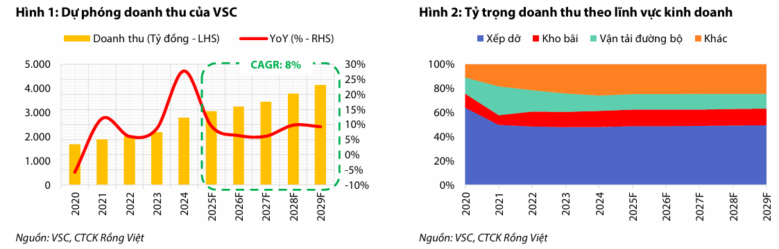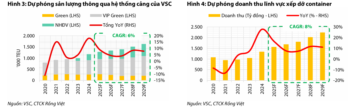 VDSC dự báo sản lượng xếp dỡ của VSC sẽ đạt tốc độ tăng trưởng kép (CAGR) 6% trong giai đoạn 2025-2029, đạt 1.6 triệu TEU vào năm 2029. Doanh thu xếp dỡ dự kiến đạt CAGR 8%, nhờ sản lượng tăng và giá dịch vụ duy trì ở nhóm cao (khoảng 1.2 triệu VND/TEU) và tăng theo xu hướng tỷ giá USD/VND.